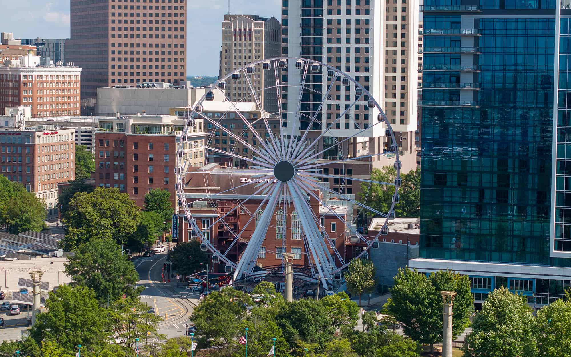 The SkyView Atlanta observation wheel is built for skyline photos and candid moments. Pose inside the gondola, frame the city through the glass, then grab a few ground shots after the ride. The backdrop is always camera-ready. When you’re done, everything’s close: stroll to Centennial Olympic Park, grab a bite nearby, or wander to dessert and nightlife without re-parking or crossing town.